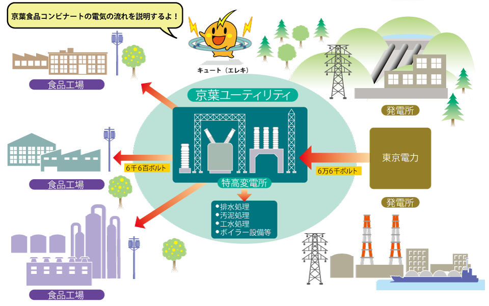 送電のロスが少なく安価な特別高圧電力を京葉ユーティリティで一括受電し、高圧にして配電しています。